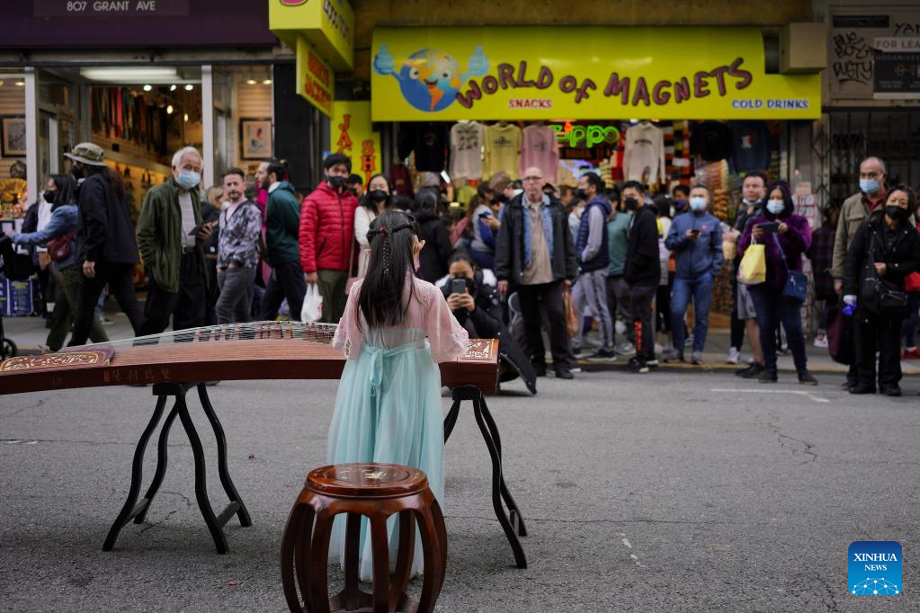 A girl performs Guzheng, or Chinese zither, during the China town's weekend market in San Francisco, the United States, Feb. 20, 2022. (Xinhua/Wu Xiaoling)