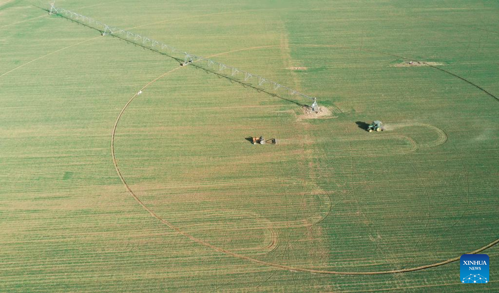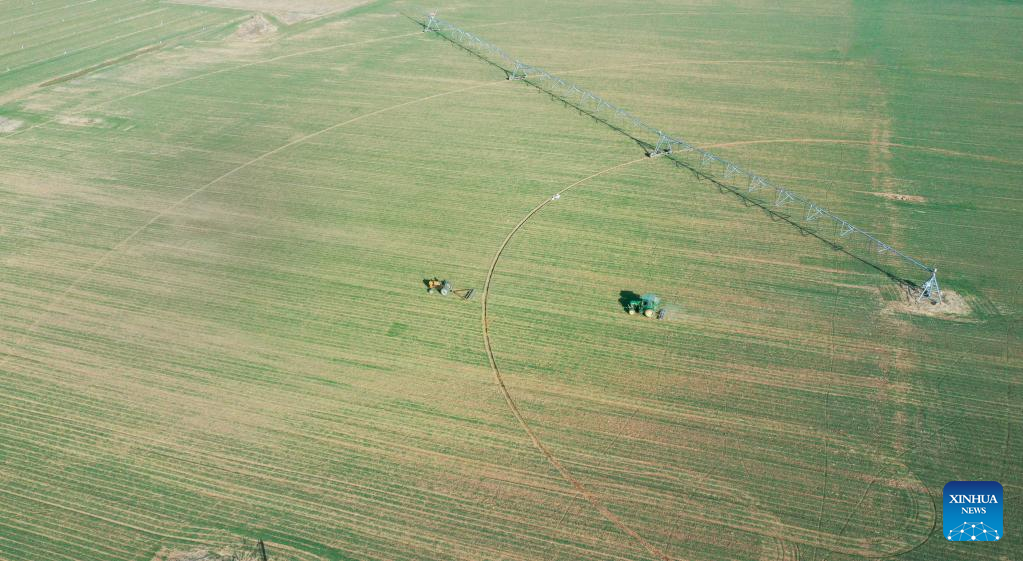 Aerial photo taken on Feb. 21, 2022 shows farmers working in a field in Zouping City, east China's Shandong Province. Farming activities are in full swing across the country. (Photo by Dong Naide/Xinhua)