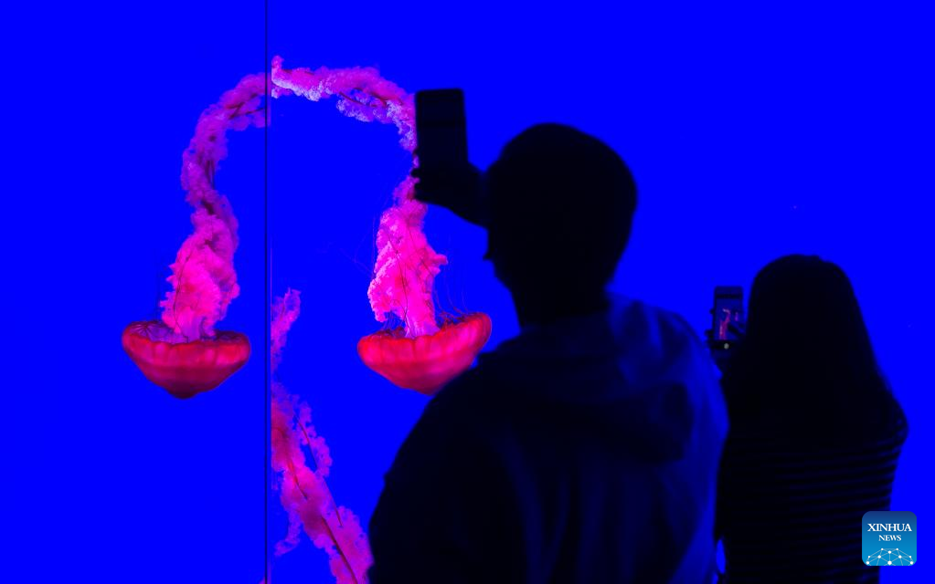 Visitors take pictures in front of a jellyfish tank at Ripley's Aquarium of Canada in Toronto, Canada, on Feb. 21, 2022. The Ripley's Aquarium of Canada drew many families to celebrate Family Day on Monday. (Photo by Zou Zheng/Xinhua)