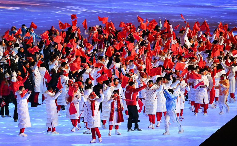 Athletes of the Olympic delegation of the People's Republic of China parade during the closing ceremony of the Beijing 2022 Olympic Winter Games at the National Stadium in Beijing, Feb. 20, 2022. (Xinhua/Xiong Qi)