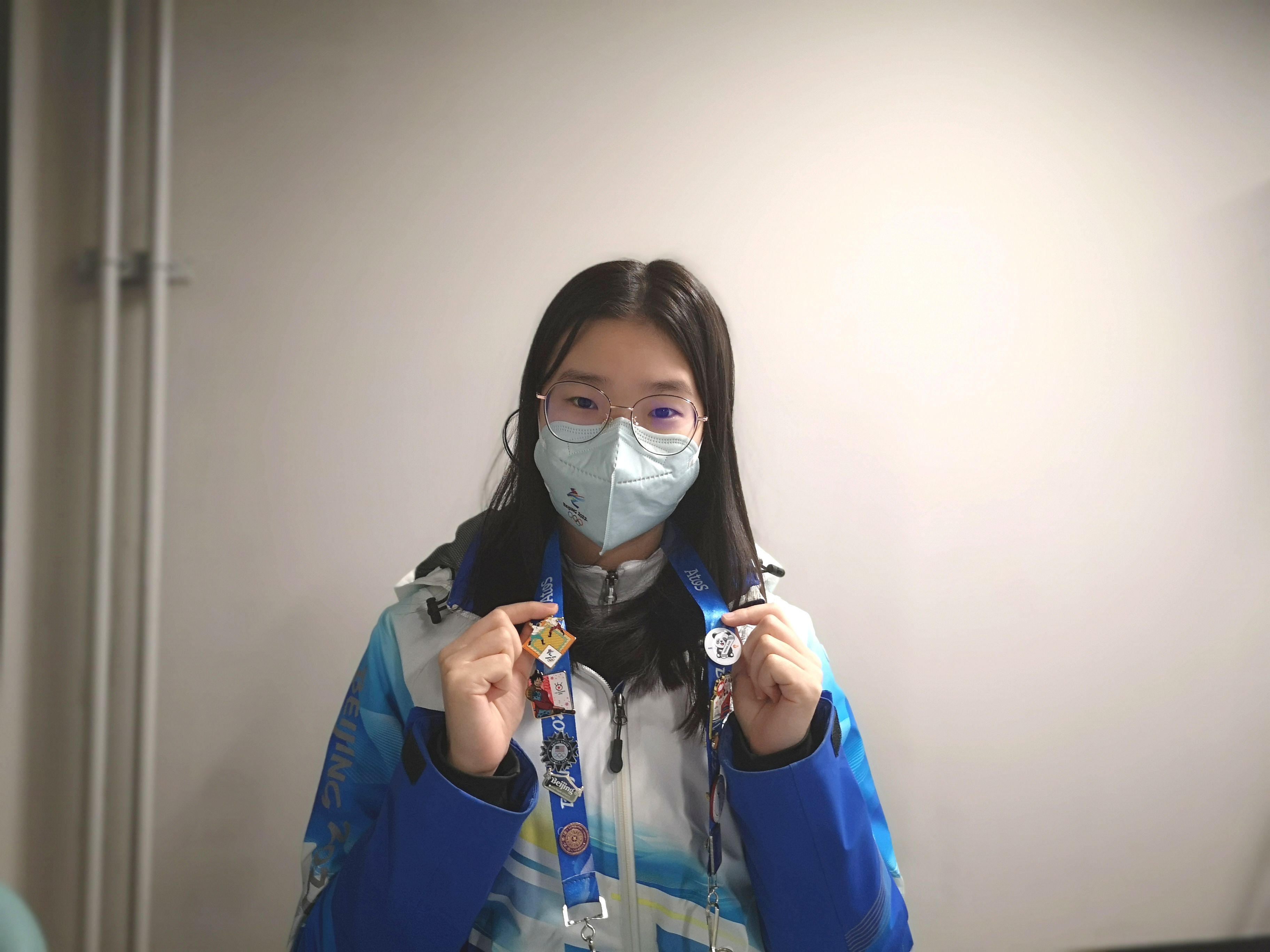 A volunteer from Beijing Foreign Studies University is displaying the pins she collected after work on Feb. 15, 2022. Exchanging pins is a tradition in Olympic events. (Source: Xinhua)