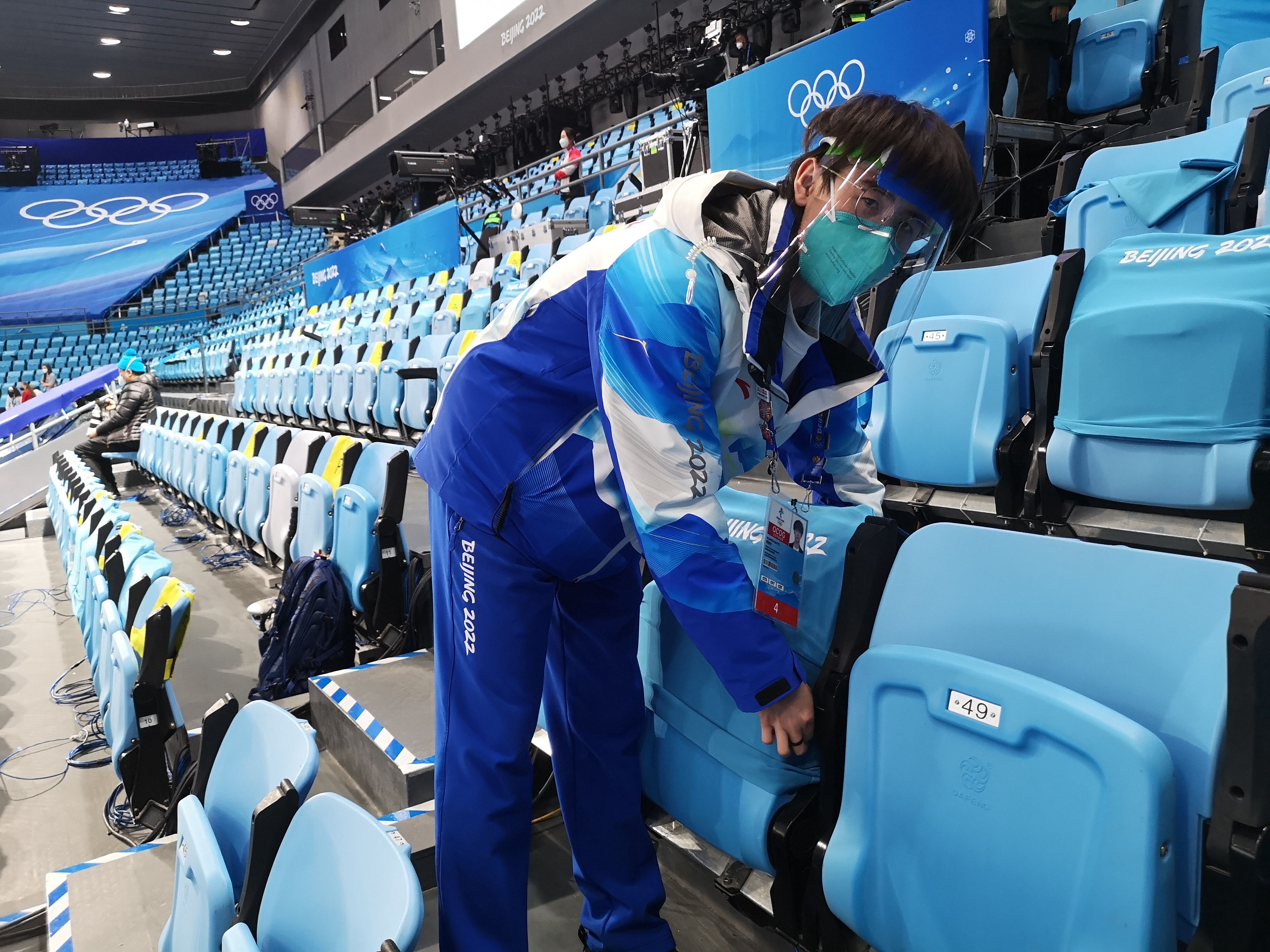 On the press tribune of the main rink in Capital Indoor Stadium, a volunteer from Beijing Foreign Studies University gets to her post early on Feb. 14, 2022. (Source: Xinhua)