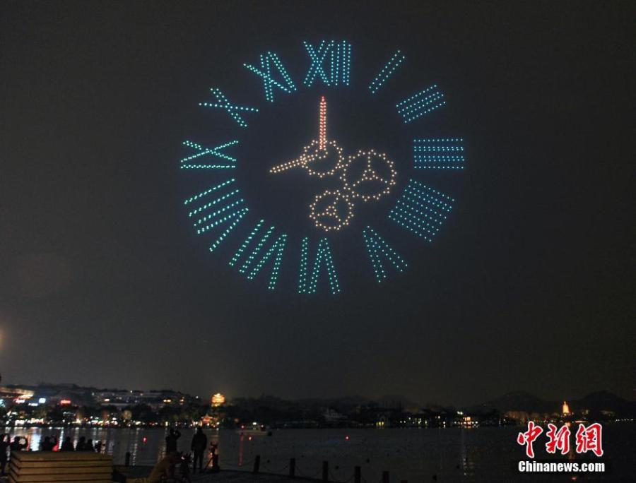 Over 1,000 illuminated drones display the pattern of a torch in the night sky above the West Lake to welcome the 200-day countdown to the 19th Asia Games in Hangzhou, capital city of east China's Zhejiang Province, Feb. 21,2022. (Photo: China News Service/Wang Gang)