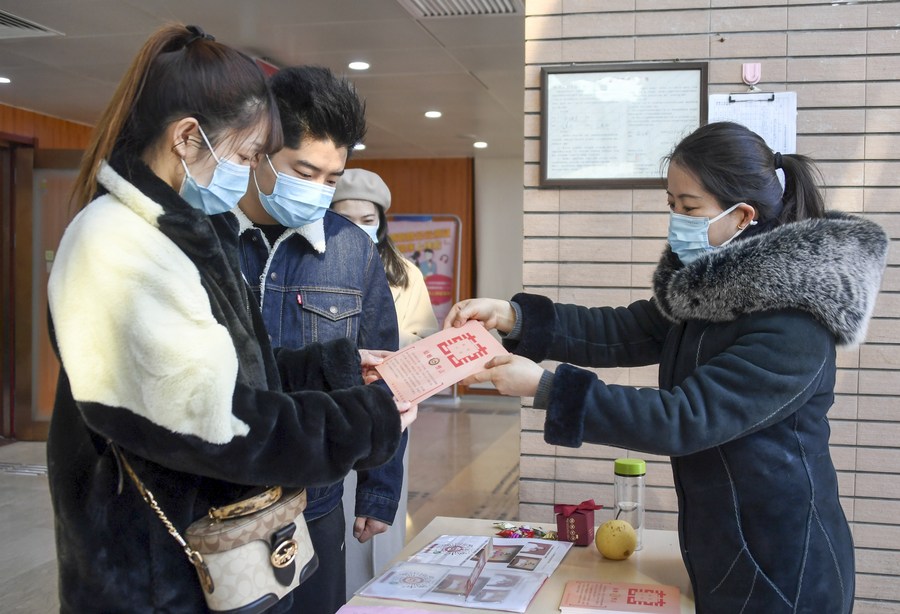 A staff member (R) presents a commemorative card to a couple at a marriage registry of Haidian District in Beijing, capital of China, Feb. 22, 2022. (Xinhua/Ren Chao)