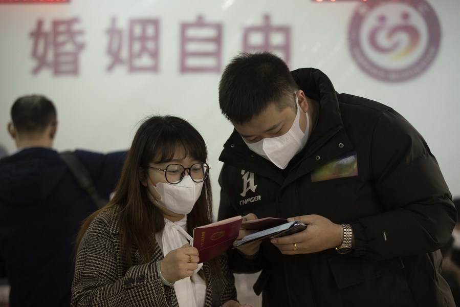 A couple registers marriage at a marriage registry of Daoli District in Harbin, capital of northeast China's Heilongjiang Province, Feb. 22, 2022. (Xinhua/Zhang Tao)
