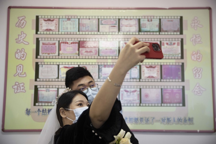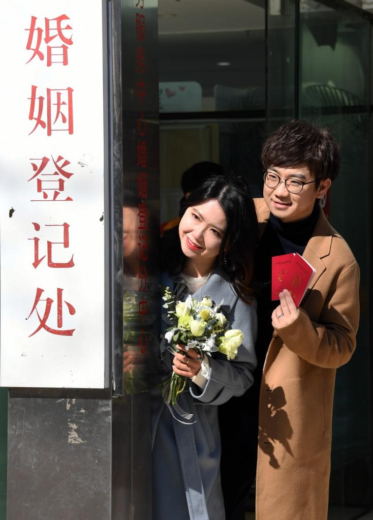 A couple poses for a photo at a marriage registry of Daoli District in Harbin, capital of northeast China's Heilongjiang Province, Feb. 22, 2022. (Xinhua/Zhang Tao)
