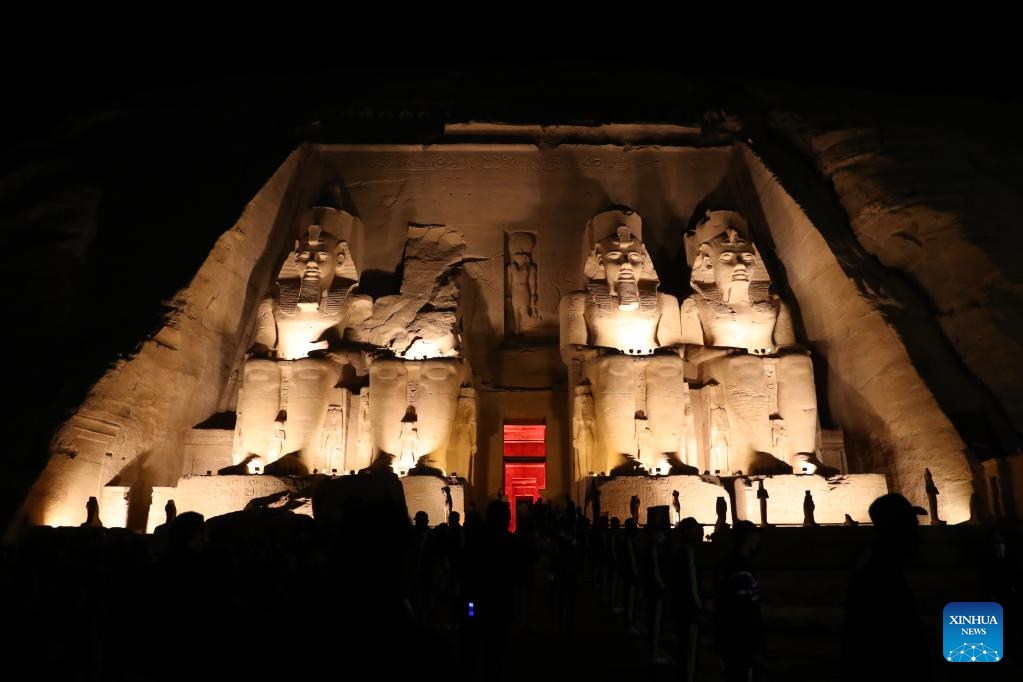 The sculptures of the Great Temple of Abu Simbel are lit up during the Sun Festival in Aswan, Egypt, Feb. 22, 2022. During the Sun Festival, crowds gather before sunrise to observe sunlight lightening the innermost sculptures including King Ramses II. The innermost sculptures remain in darkness inside the Great Temple of Abu Simbel throughout the year except on Feb. 22 and Oct. 22, when the sunlight showers on the sculptures to commemorate the king's coronation and birthday. (Xinhua/Wang Dongzhen)
