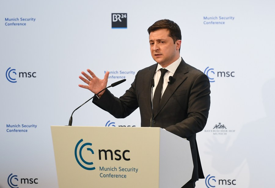 Ukraine's President Volodymyr Zelensky makes a speech during the Munich Security Conference (MSC) held in Munich, Germany, Feb. 19, 2022. (Xinhua/Lu Yang)