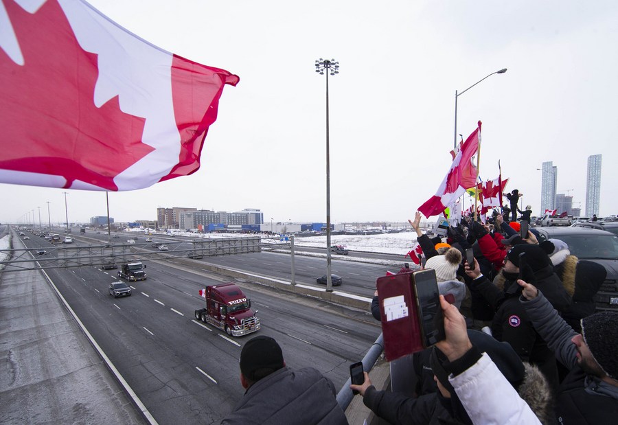 People gather on a bridge over Highway 400 in support of truckers, who are on their way to Ottawa for the "freedom convoy" protest, in Vaughan, Ontario, Canada, on Jan. 27, 2022. The "freedom convoy" was sparked by outrage over a vaccine mandate recently imposed on Canadian-U.S. cross-border truckers. (Photo by Zou Zheng/Xinhua)