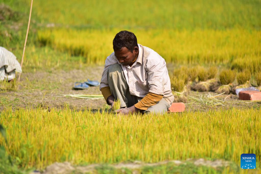 A farmer uproots rice seedlings at a paddy field in Mayong village, Morigaon district of India's northeastern state of Assam, Feb. 22, 2022. (Str/Xinhua)