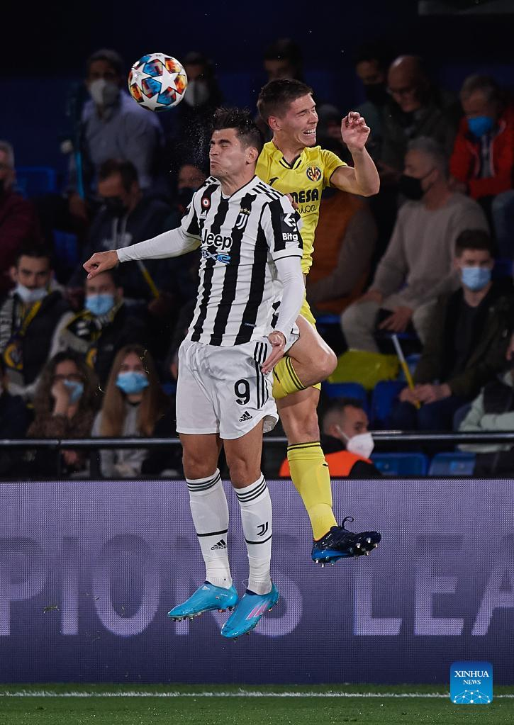 Alvaro Morata (R) of Juventus vies with Juan Foyth of Villarreal during the UEFA Europa League play-off first leg soccer match between Villareal and Juventus in Vila-Real, Spain, Feb. 22, 2022. (str/Xinhua)