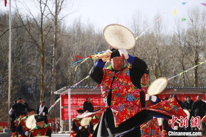 Local dancers perform "Biangbiang Dance", a traditional folk dance of China's Tu ethnic group, in Haidong City, northwest China's Qinghai Province, Feb. 22, 2022. (Photo: China News Servince/Ma Mingyan)