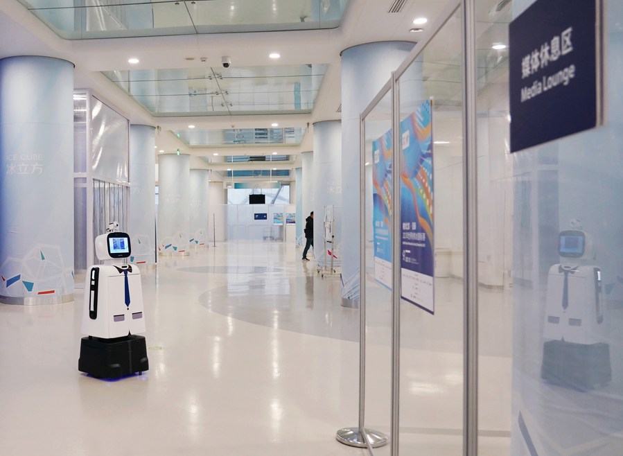A 5G intelligent robot works in the venue during the World Wheelchair Curling Championship 2021 at the National Aquatics Center (the Water Cube), which was converted to the "Ice Cube", in Beijing, capital of China, Oct. 23, 2021. (Xinhua/Zhang Chenlin)