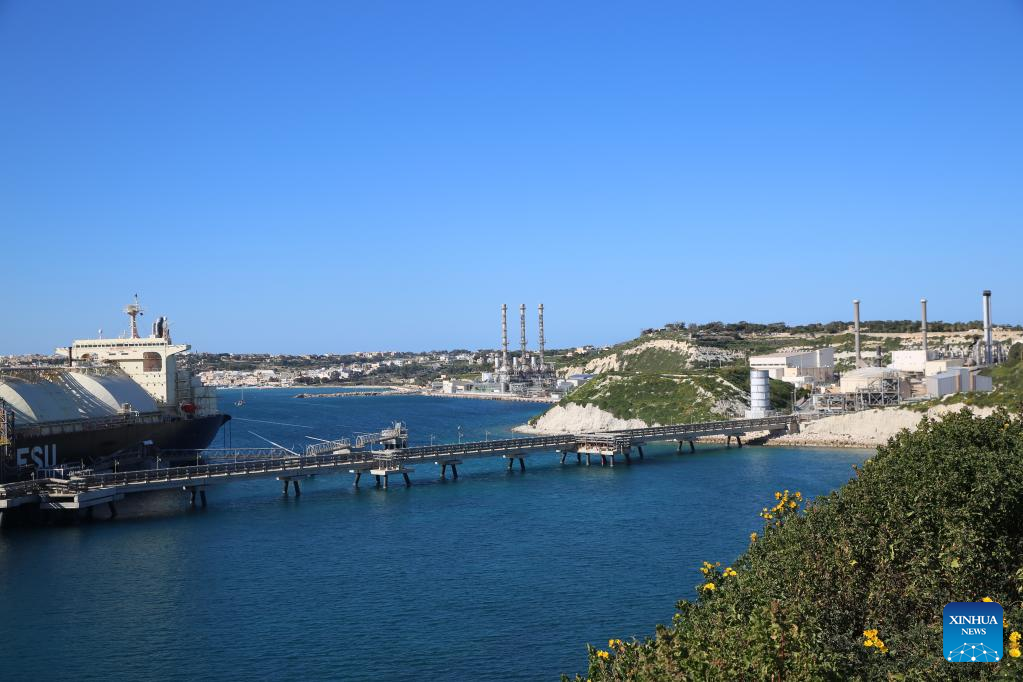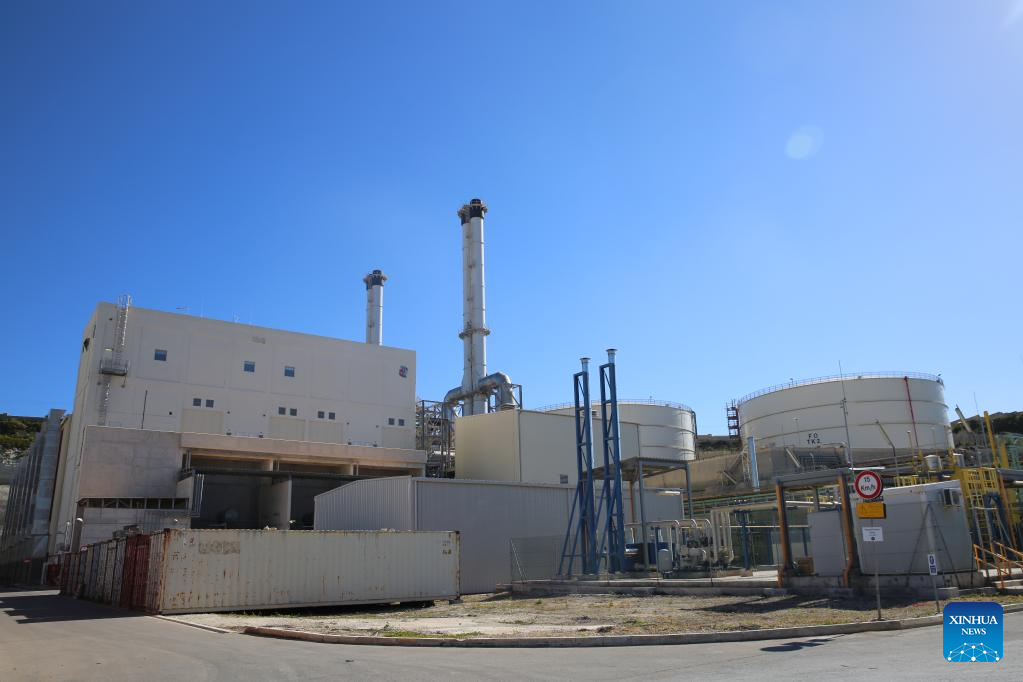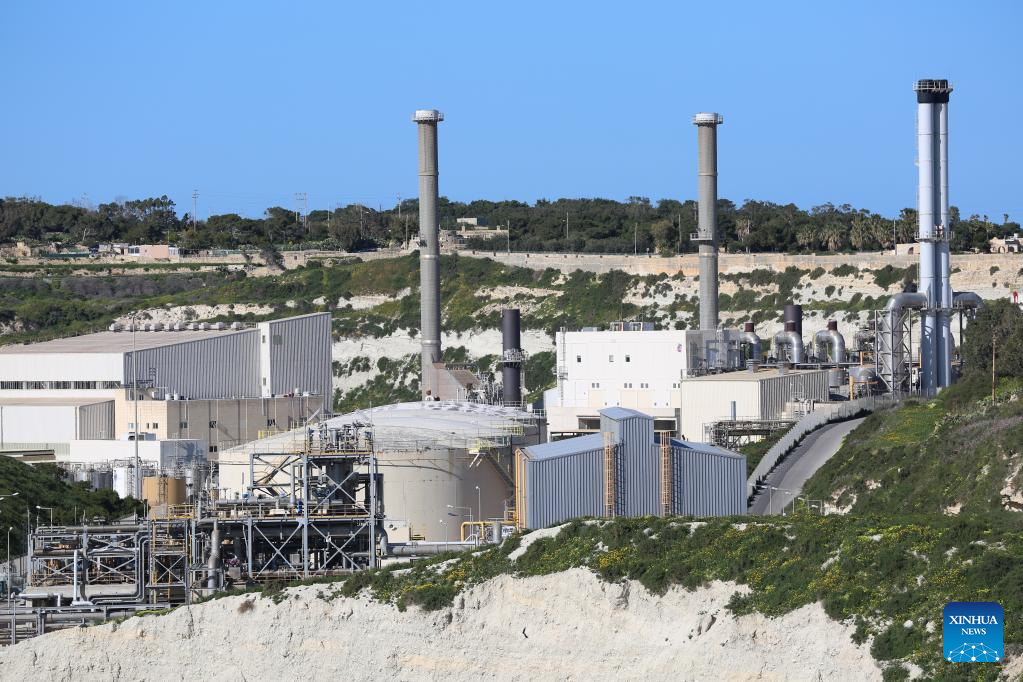 Photo taken on Feb. 23, 2022 shows a view of the Delimara power station in Marsaxlokk, southeastern Malta. The Delimara 3 (D3) power station, controlled and operated by China's Shanghai Electric Power (Malta) Holding Co., Ltd. (SEP), has played an important role in power supply in Malta, and emission reduction and air quality improvement in the areas around the power plant. The D3 station was turned from a heavy oil-fired power station into a gas-fired one by the SEP. (Xinhua/Chen Wenxian)
