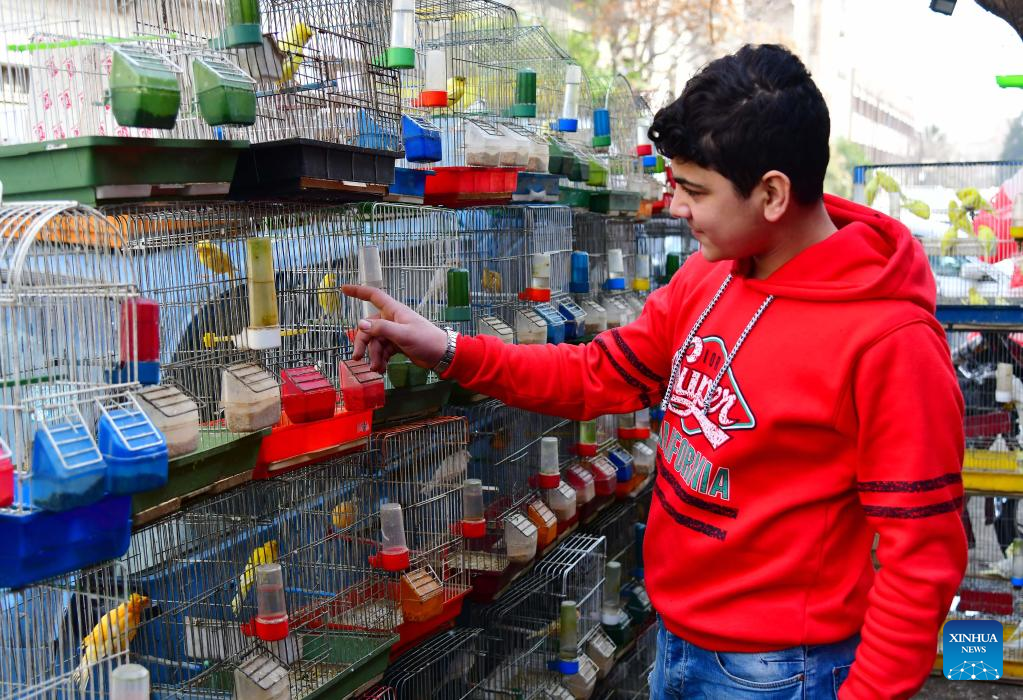 Pet birds are sold at a market in Damascus, Syria, Feb. 22, 2022. (Photo by Ammar Safarjalani/Xinhua)