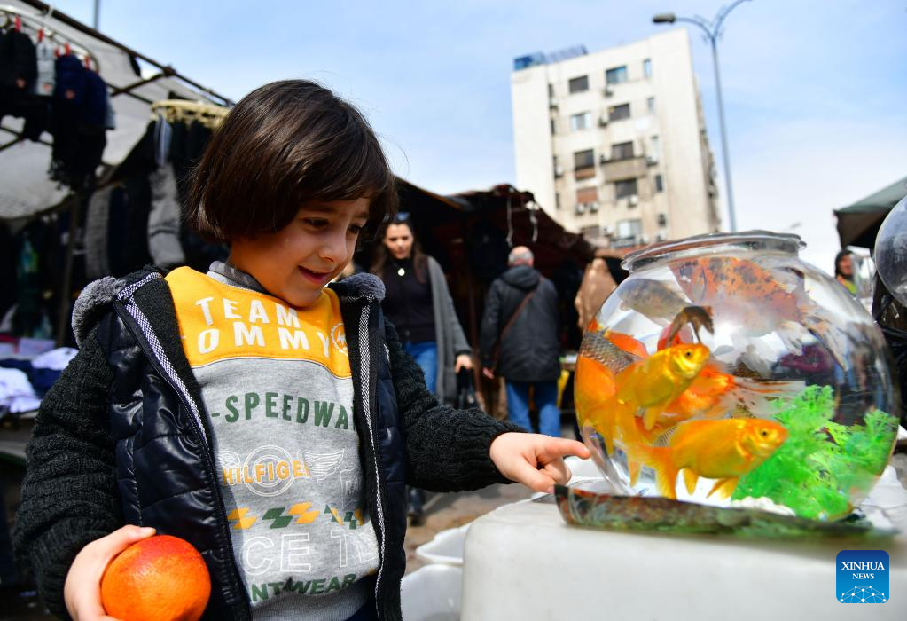A child looks at goldfish for sale at a market in Damascus, Syria, Feb. 22, 2022. (Photo by Ammar Safarjalani/Xinhua)