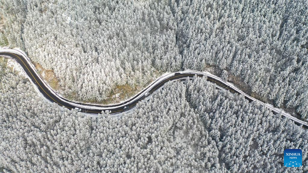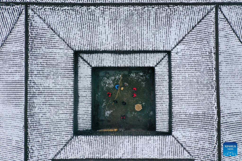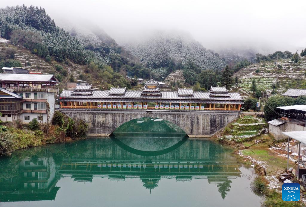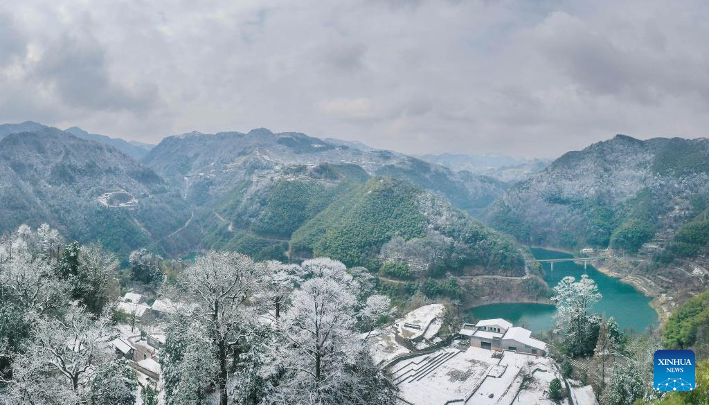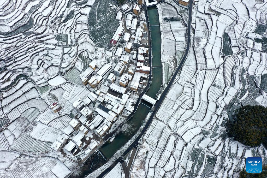 Photo taken on Feb. 23, 2022 shows the snow view of Jiangkou Village of Lejiang Township in Longsheng County, south China's Guangxi Zhuang Autonomous Region. (Photo by Wei Jiyang/Xinhua)
