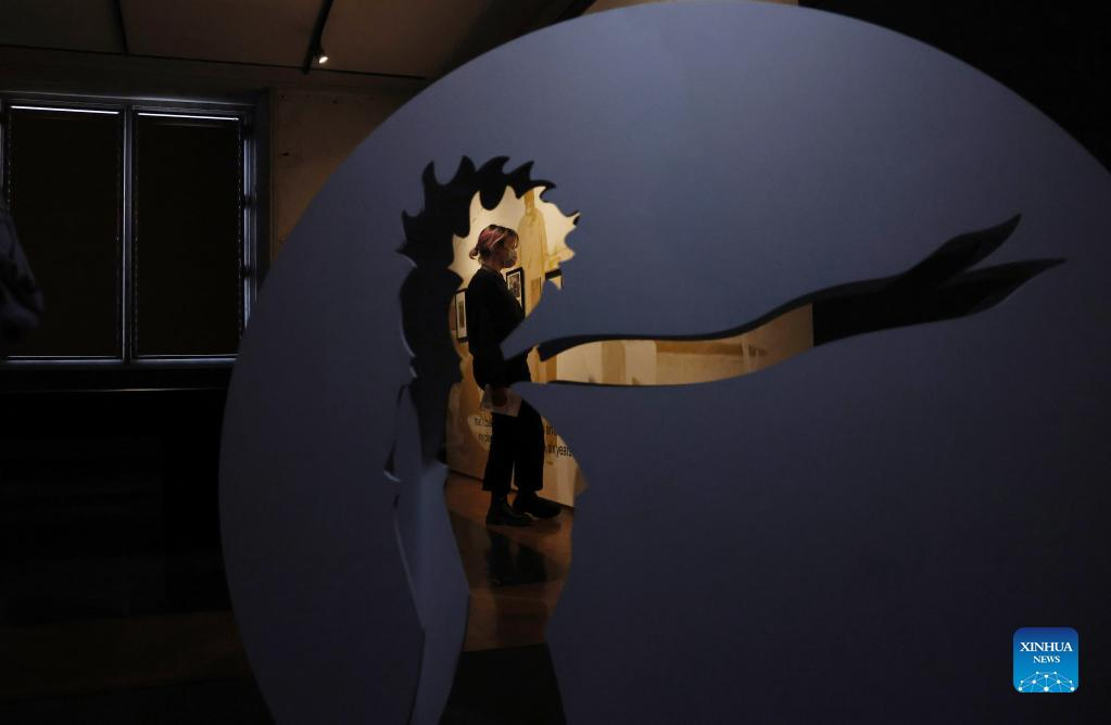 A woman visits the exhibition "A la Rencontre du Petit Prince" (Meet the Little Prince) at the Musee des Art Decoratifs de Paris, in Paris, France, Feb. 23, 2022. The exhibition features some 600 artworks by the French writer, designer and illustrator Antoine de Saint-Exupery, including the original manuscript for the first time exhibited in France. The exhibition runs from Feb. 17 to June 26, 2022. (Xinhua/Gao Jing)