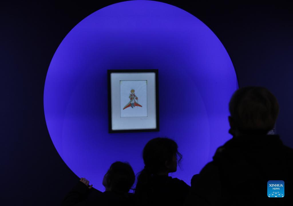 People visit the exhibition "A la Rencontre du Petit Prince" (Meet the Little Prince) at the Musee des Art Decoratifs de Paris, in Paris, France, Feb. 23, 2022. The exhibition features some 600 artworks by the French writer, designer and illustrator Antoine de Saint-Exupery, including the original manuscript for the first time exhibited in France. The exhibition runs from Feb. 17 to June 26, 2022. (Xinhua/Gao Jing)