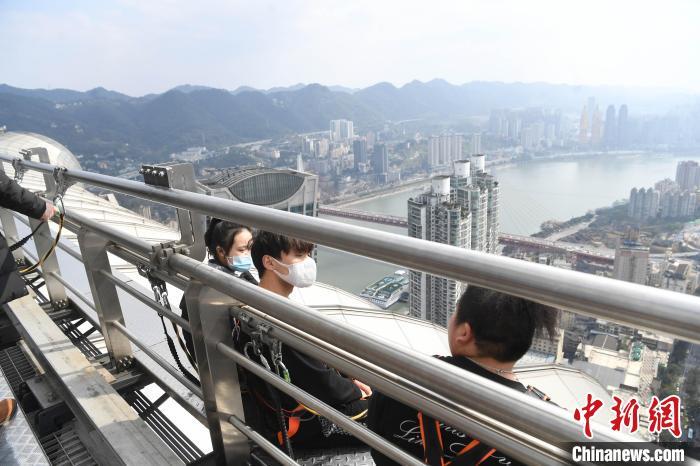 Visitors pose for photo on a skyscraper in southwest China's Chongqing Feb. 23, 2022. (Photo: China News Service/Zhang Chao)