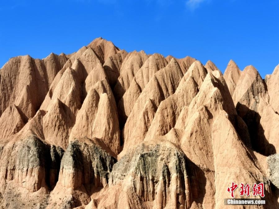 Photo taken on Feb.22, 2022 shows the Danxia landform on the upper reach of Yellow River in Jainca County, Huangnan Tibetan Autonomous Prefecture, Qinghai Province. (Photo: China News Service/Zhang Tianfu)