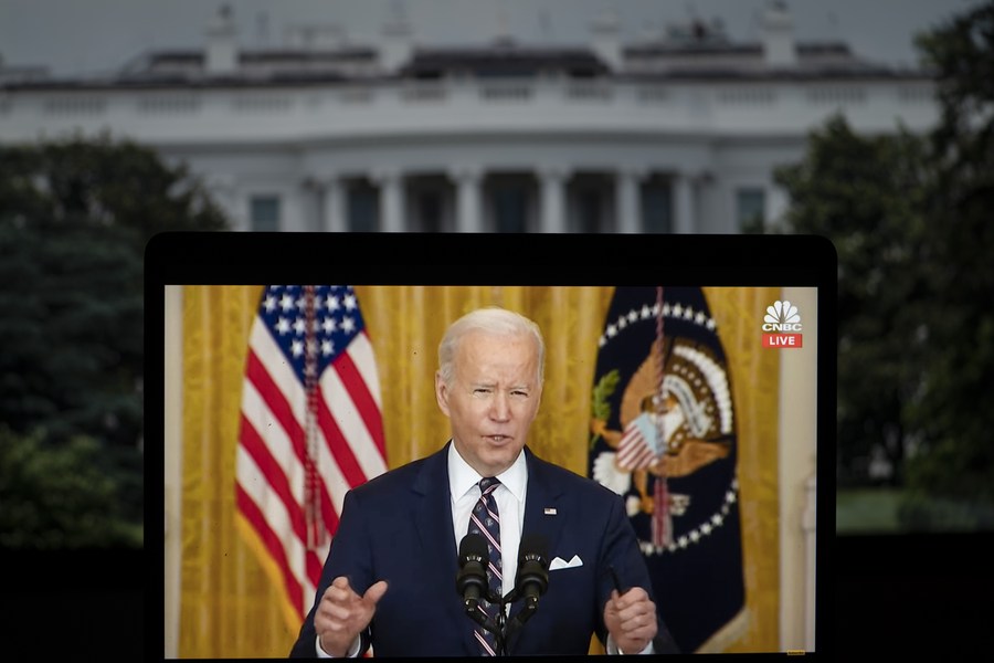 Photo taken in Arlington, Virginia, the United States, on Feb. 22, 2022 shows a screen broadcasting U.S. President Joe Biden delivering remarks on Ukraine situation in a live stream provided by CNBC. (Xinhua/Liu Jie)