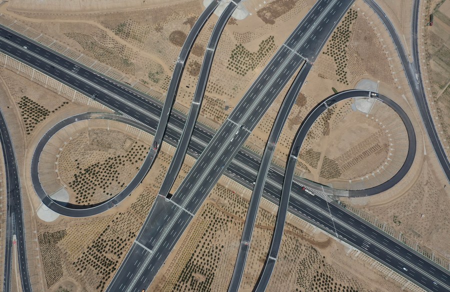 Aerial photo taken on May 10, 2021 shows a junction of the first phase of Beijing-Dezhou expressway and Tianjin-Shijiazhuang expressway in north China's Hebei Province. (Xinhua/Zhu Xudong)