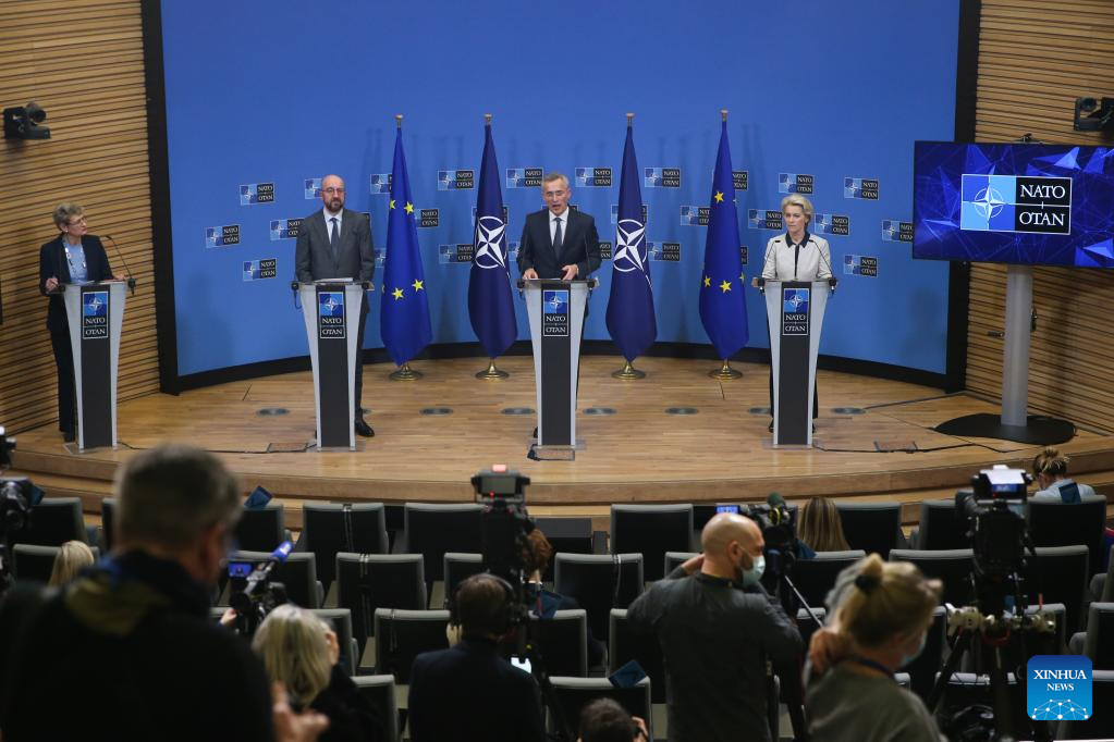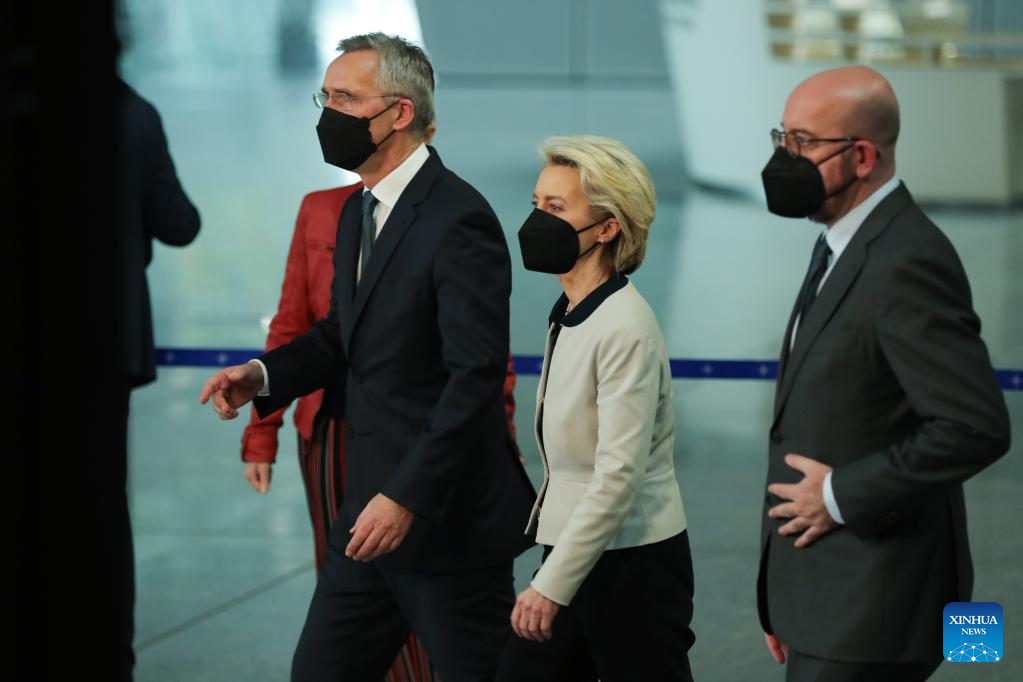 Secretary-General of the North Atlantic Treaty Organization (NATO) Jens Stoltenberg (C), European Commission President Ursula von der Leyen (R) and European Council President Charles Michel attend a press conference at NATO headquarters in Brussels, Belgium, Feb. 24, 2022. (Xinhua/Zheng Huansong)