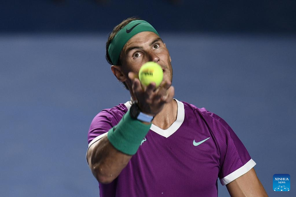 Rafael Nadal of Spain serves during the men's singles round of 16 match against Stefan Kozlov of the United States at the 2022 ATP Mexican Open tennis tournament in Acapulco, Mexico, Feb. 23, 2022. (Xinhua/Xin Yuewei)
