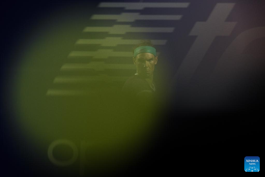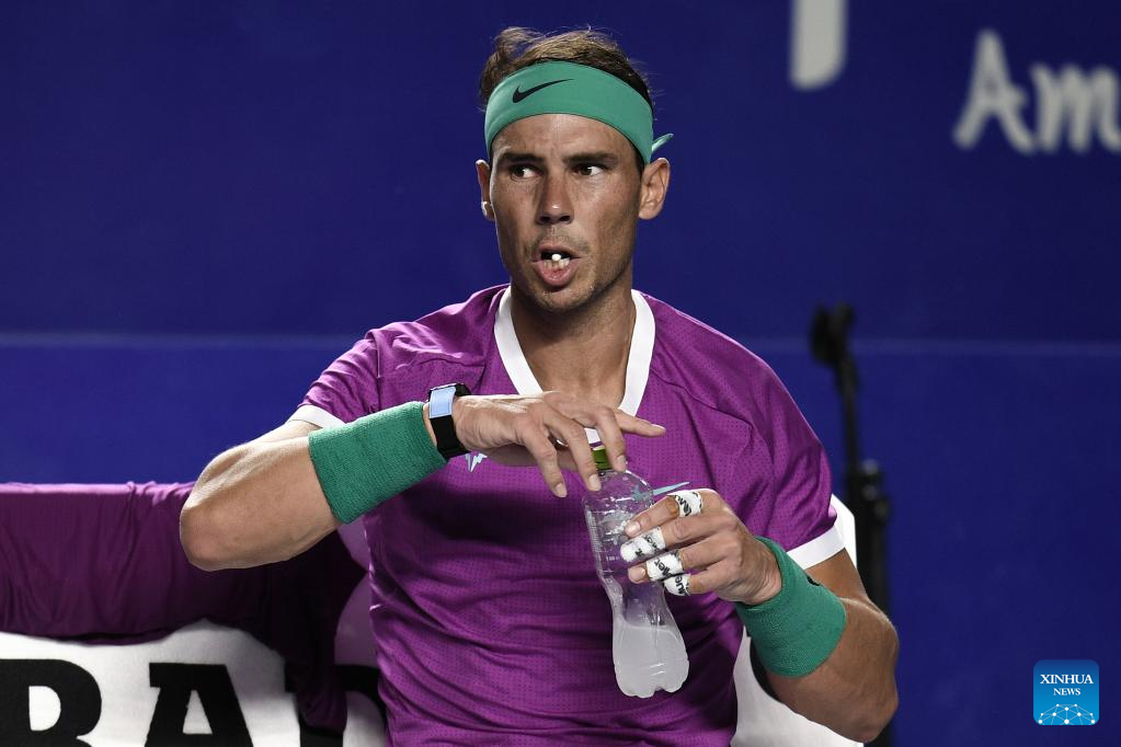 Rafael Nadal of Spain reacts during a break time in the men's singles round of 16 match against Stefan Kozlov of the United States at the 2022 ATP Mexican Open tennis tournament in Acapulco, Mexico, Feb. 23, 2022. (Xinhua/Xin Yuewei)