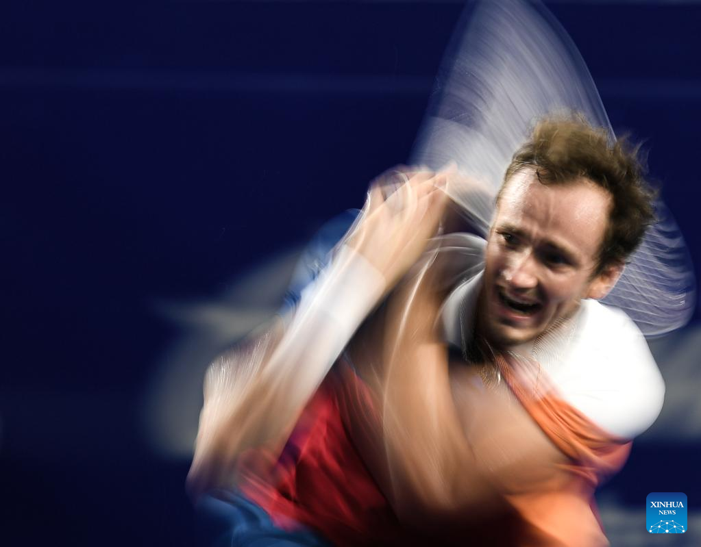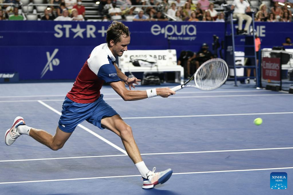 Daniil Medvedev of Russia hits a return during the men's singles round of 16 match between Daniil Medvedev of Russia and Pablo Andujar of Spain at the 2022 ATP Mexican Open tennis tournament in Acapulco, Mexico, Feb. 23, 2022. (Xinhua/Xin Yuewei)