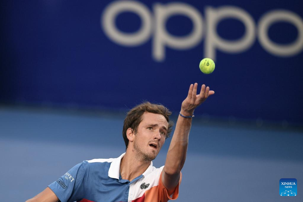 Daniil Medvedev of Russia serves during the men's singles round of 16 match between Daniil Medvedev of Russia and Pablo Andujar of Spain at the 2022 ATP Mexican Open tennis tournament in Acapulco, Mexico, Feb. 23, 2022. (Xinhua/Xin Yuewei)