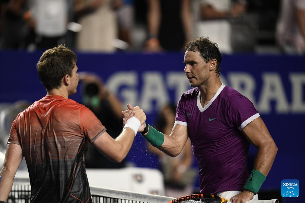 Rafael Nadal (R) of Spain greets his opponent after winning the men's singles round of 16 match against Stefan Kozlov of the United States at the 2022 ATP Mexican Open tennis tournament in Acapulco, Mexico, Feb. 23, 2022. (Xinhua/Xin Yuewei)