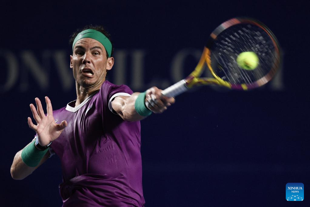 Rafael Nadal of Spain hits a return during the men's singles round of 16 match against Stefan Kozlov of the United States at the 2022 ATP Mexican Open tennis tournament in Acapulco, Mexico, Feb. 23, 2022. (Xinhua/Xin Yuewei)