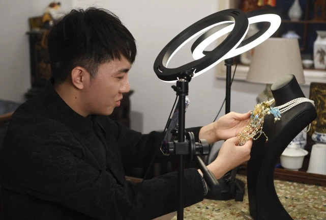 Gu Guoqiang introduces filigree inlay artworks in a livestreaming session. (Xinhua/Wang Quanchao)