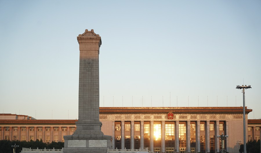 Photo taken on Sept. 8, 2020 shows the Great Hall of the People and the Monument to the People's Heroes at sunrise in Beijing, capital of China.(Xinhua/Ju Huanzong)