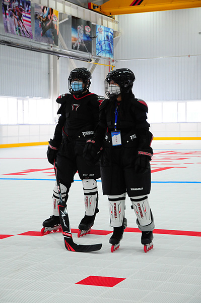 Students play roller skating hockey.[Photo by Xu Lin/China Daily]