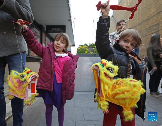 Children show dance lion souvenirs after the screening of Chinese animation "I Am What I Am" in London, Britain, on Feb. 26, 2022. Unfolding from a brief introduction to lion dance, a centuries-old Chinese folk dance mostly performed to celebrate Lunar New Year, the movie "I Am What I Am" follows an underdog teenager in Guangdong, southern China, as he joins hands with two friends to pursue a dream against all odds -- becoming the best lion dance performer. (Xinhua/Li Ying)