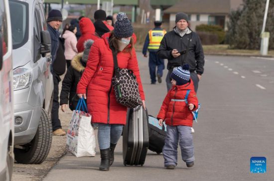 People from Ukraine arrive at Beregsurany, eastern Hungary, Feb. 26, 2022. (Photo by Attila Volgyi/Xinhua)