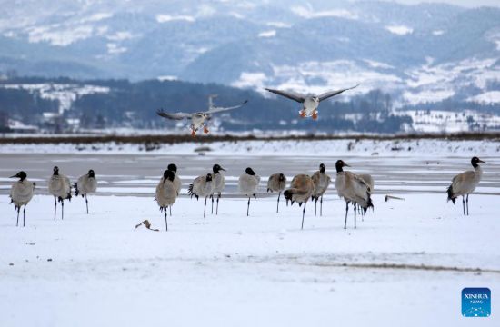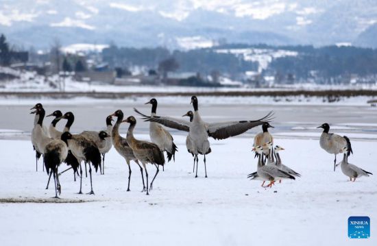 Black-necked cranes and other migrant birds are seen at the Caohai National Nature Reserve in Weining Yi, Hui and Miao Autonomous County, southwest China's Guizhou Province, Feb. 22, 2022. Caohai was listed as a national nature reserve in 1992 and is an important wintering ground and migration transfer station for birds such as black-necked cranes, grey cranes and spotted geese. (Photo by He Huan/Xinhua)