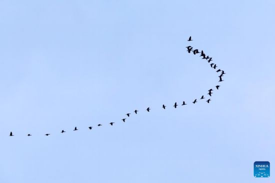 Migrant birds are seen flying in the sky at the Caohai National Nature Reserve in Weining Yi, Hui and Miao Autonomous County, southwest China's Guizhou Province, Feb. 22, 2022. Caohai was listed as a national nature reserve in 1992 and is an important wintering ground and migration transfer station for birds such as black-necked cranes, grey cranes and spotted geese. (Photo by He Huan/Xinhua)