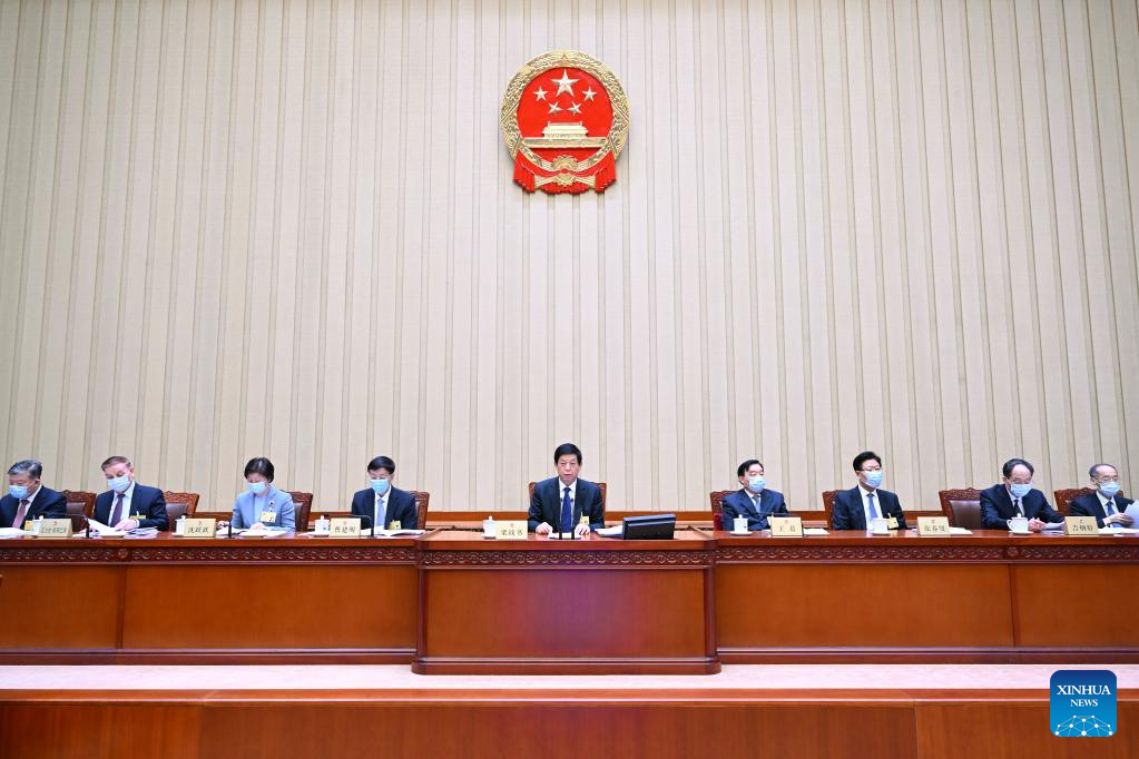 Li Zhanshu, chairman of the National People's Congress (NPC) Standing Committee, presides over the 110th meeting of the Council of Chairpersons of the 13th NPC Standing Committee at the Great Hall of the People in Beijing, capital of China, Feb. 27, 2022. (Xinhua/Zhang Ling)