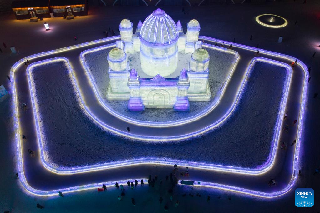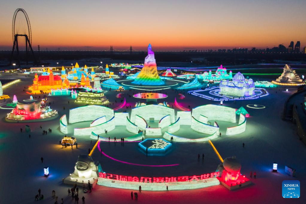 Aerial photo shows tourists visiting the Harbin Ice-Snow World in Harbin, northeast China's Heilongjiang Province, Feb. 27, 2022. The 23rd Harbin Ice-Snow World closed on Sunday. (Xinhua/Xie Jianfei)