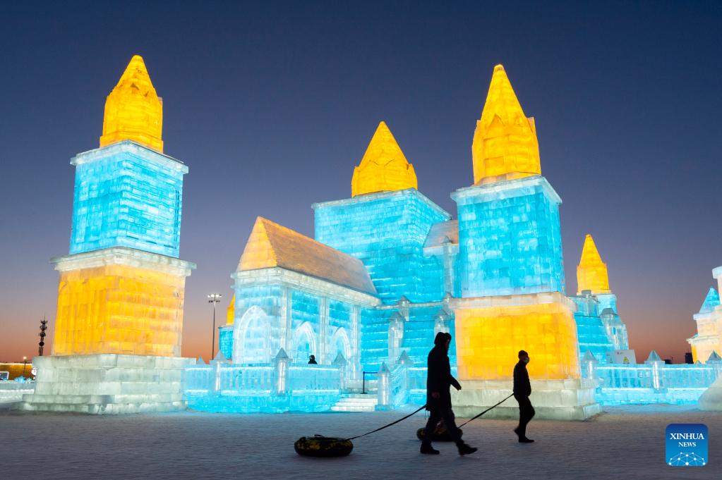 Tourists visit the Harbin Ice-Snow World in Harbin, northeast China's Heilongjiang Province, Feb. 27, 2022. The 23rd Harbin Ice-Snow World closed on Sunday. (Xinhua/Zhang Tao)