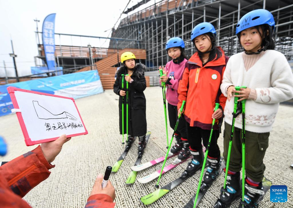 Member of the "Dieyun" ski team Wang Xinyue shares her experience in skiing with classmates at the special education school in Xindu District of Chengdu, southwest China's Sichuan Province, Feb. 25, 2022. When seeing the boys and girls skiing down the slope, no one will realize they are anything different from other ski-loving youngsters until noticing their coach communicating with them mainly through writing and gesturing.
