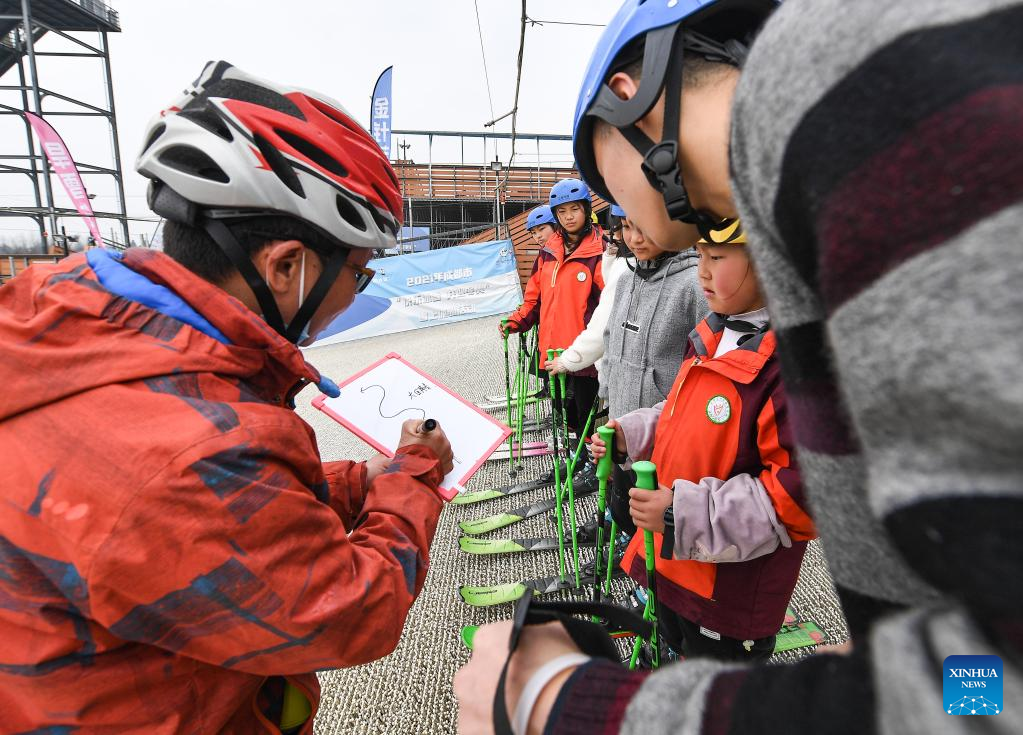 Members of the "Dieyun" ski team practice in a training session at a dry ski training facility in Xindu District of Chengdu, southwest China's Sichuan Province, Feb. 25, 2022. When seeing the boys and girls skiing down the slope, no one will realize they are anything different from other ski-loving youngsters until noticing their coach communicating with them mainly through writing and gesturing.