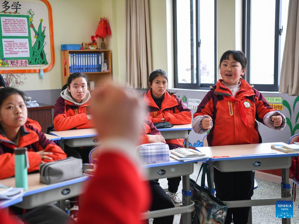 Member of the "Dieyun" ski team Yang Changrong (1st R) answers as her teacher gestures at the special education school in Xindu District of Chengdu, southwest China's Sichuan Province, Feb. 25, 2022. When seeing the boys and girls skiing down the slope, no one will realize they are anything different from other ski-loving youngsters until noticing their coach communicating with them mainly through writing and gesturing.