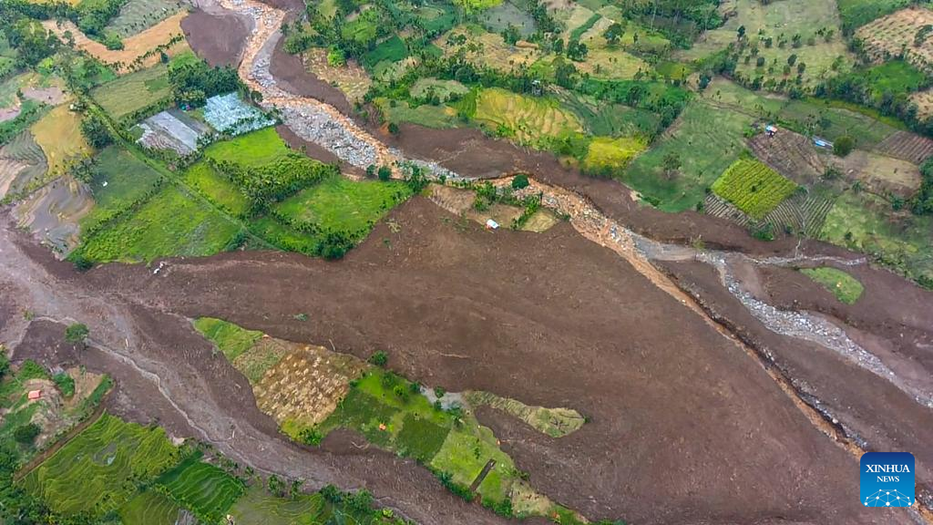 An aerial photo released by District Disaster Management Agency (BPBD) Limapuluh Kota shows mud caused by landslides after a 6.1 magnitude quake in Pasaman Barat, West Sumatra, Indonesia, Feb. 27, 2022. (BPBD Limapuluh Kota/Handout via Xinhua)