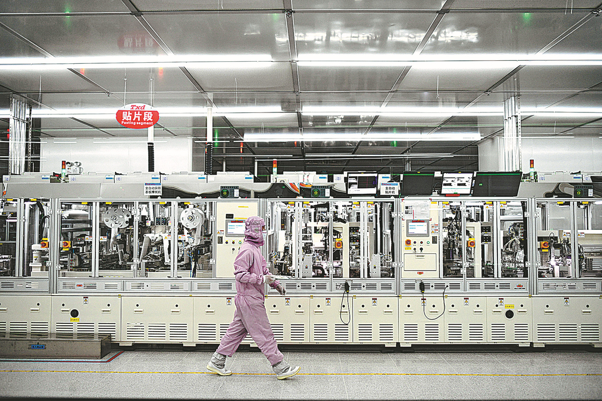 A worker walks across a digital manufacturing workshop of an electronic technology company in Ganzhou, Jiangxi province, on Feb 19. [Photo by Zhu Haipeng/For China Daily]