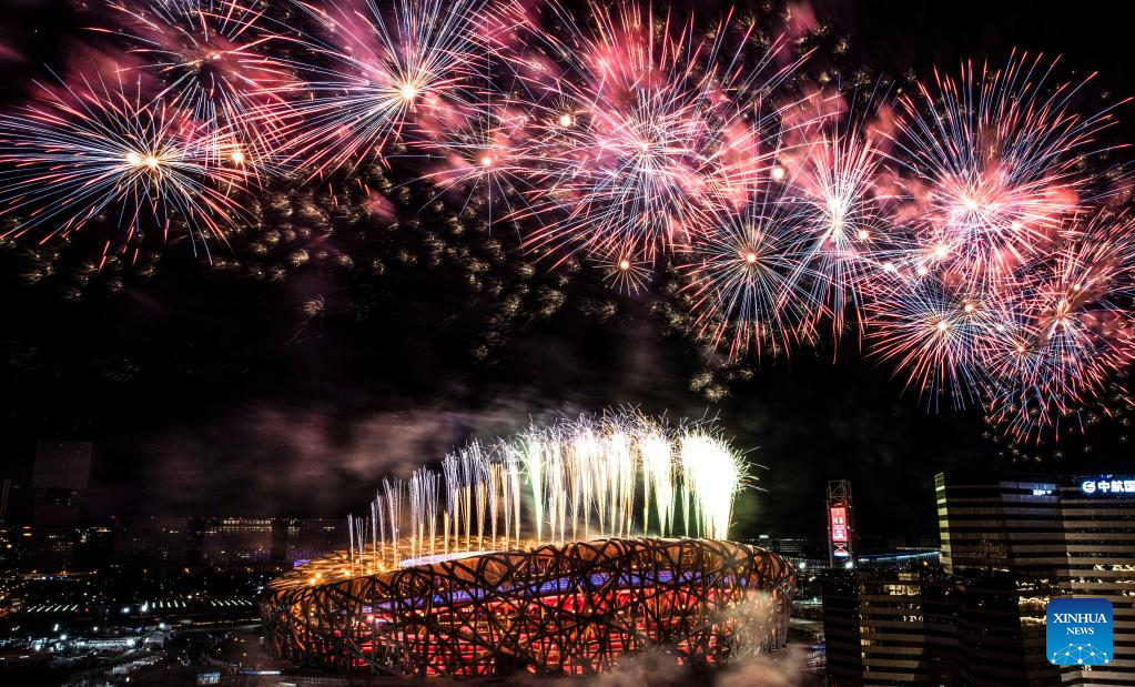 Fireworks illuminate the night sky during the closing ceremony of the 24th Olympic Winter Games at the National Stadium in Beijing, capital of China, Feb. 20, 2022. (Xinhua/Wu Huiwo)
